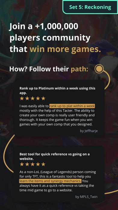 Tacter is your #1 TFT app. Join thousands of users that use Tacter to win more games on Teamfight Tactics and climb the ranking ladder. Improve your gaming experience by getting detailed compositions.. Read more