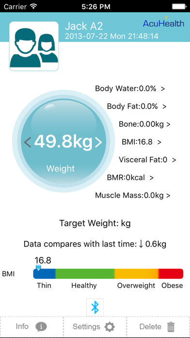 AcuHealth Track your health and stay fit with AcuHealth! This application allows you to easily monitor essential health and fitness data for: Body Weight, Body Fat Rate, Body Water, Bone Mass, Musc.. Read more