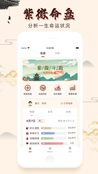 紫微斗数在古代被尊称为“帝王学”,只限于皇族中人或是有皇帝钦点的官员可以习得。 以天干地支阴阳五行为基础,通过对星象的分析及人星关系的定位推演紫微排盘及斗数详解。 紫微命盘通过对先天命盘的分析,说明当前自身状况、精神德行、子女状况、父母关系、田宅家境、兄弟关系、人际关系、迁移发展状态。 应用特点: 【排盘分析】流日盘、流月盘、天盘,全面分析运势发展、个人命运特点。 【今日运势】每日运势指数,结合.. Read more
