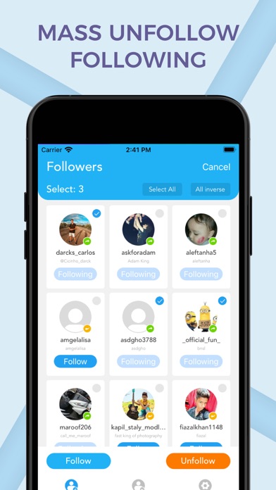 Mass unfollow Instagram followers. Mass follow instagram followers. Mass delete likes on Instagram. View follower/following change on home widget. Bigger widget card provides more information. Please .. Read more