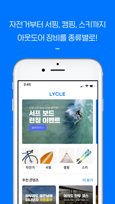 [ 자전거부터 서핑, 캠핑, 스키까지 ] 매일매일 쓸 것도 아닌데, 비싼 장비들을 굳이 사야 될까? 이젠 합리적으로 필요할 때만 라이클에서 빌려서 쓰세요! [ 이젠 원하는 자전거를 골라 빌리세요 ] 누구나 똑같은 자전거는 이제 그만! 내 맘에 쏙 드는 자전거를 골라, 색다른 라이딩을 즐겨보세요! 세상 가벼운 로드자전거와 빠른 속도감을, 최신 사양의.. Read more