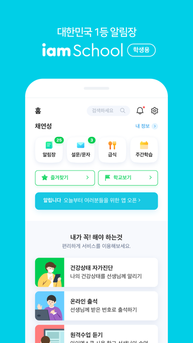 이제 학교생활, 아이엠스쿨 학생용에 맡기세요! 대한민국 1등 알림장, 인싸 학생 필수앱 아이엠스쿨 학생용. 그거 알아요? 아이엠스쿨 학생용에 여러분들이 좋아할만한 기능이 계속해서 추가될거라는거~ 업데이트를 꼭 확인하세요! 1. 학교와 선생님이 보내주는 소식 - 알림장, 주간학습, 앨범, 메시지~ 다 받아봐요! 2. 오늘 뭐 먹을까요? - 급식 메뉴도 설.. Read more