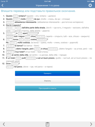 К упражнениям всегда есть полные ответы, так что вы можете свериться как с текстом, так и прослушать правильные ответы на итальянском языке, следя глазами по тексту.