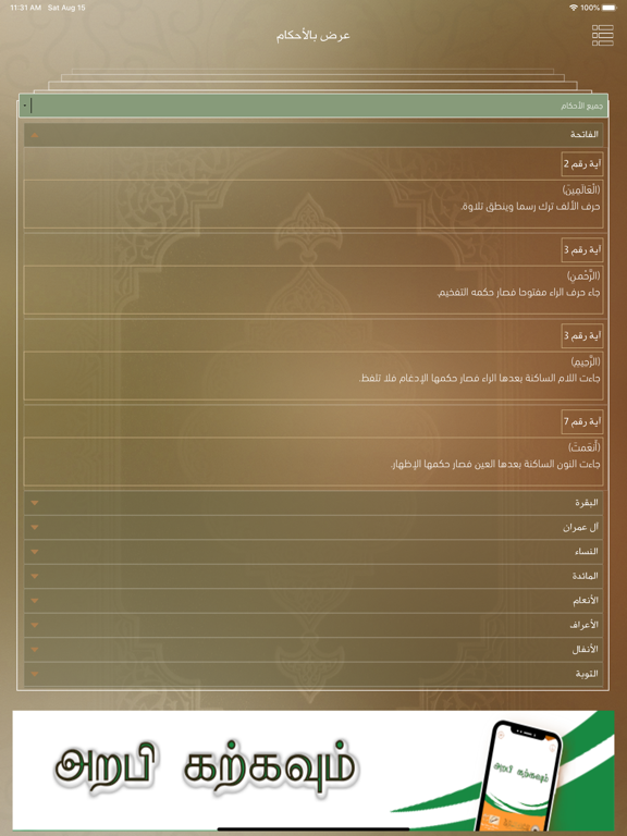 -	قائمة بأسماء السور التي بها أمثلة على الحكم المختار وبالنقر على سورة معينة يتم فتح قائمة فرعية بها الأمثلة الواردة بالسورة وبالنقر على المثال يتم فتح الصفحة التي بها المثال ويمكنك عرض جميع الأحكام في السورة الواحدة، أو عرض حكم واحد فقط منها.