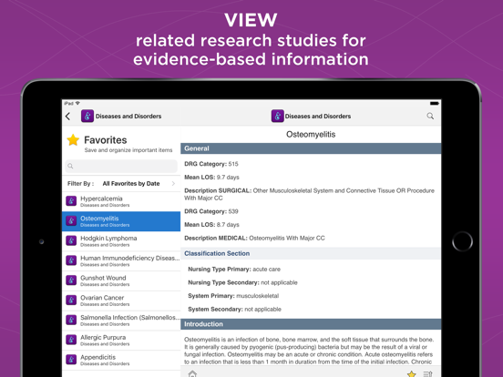 • Comprehensive entries include: causes, additional considerations, assessment, diagnosis, planning, documentation, discharge guidelines, and more