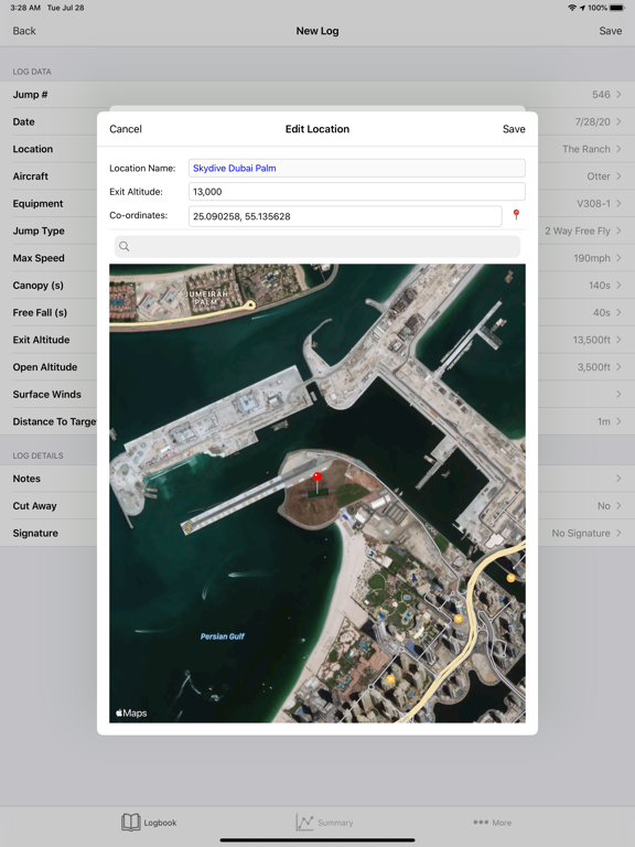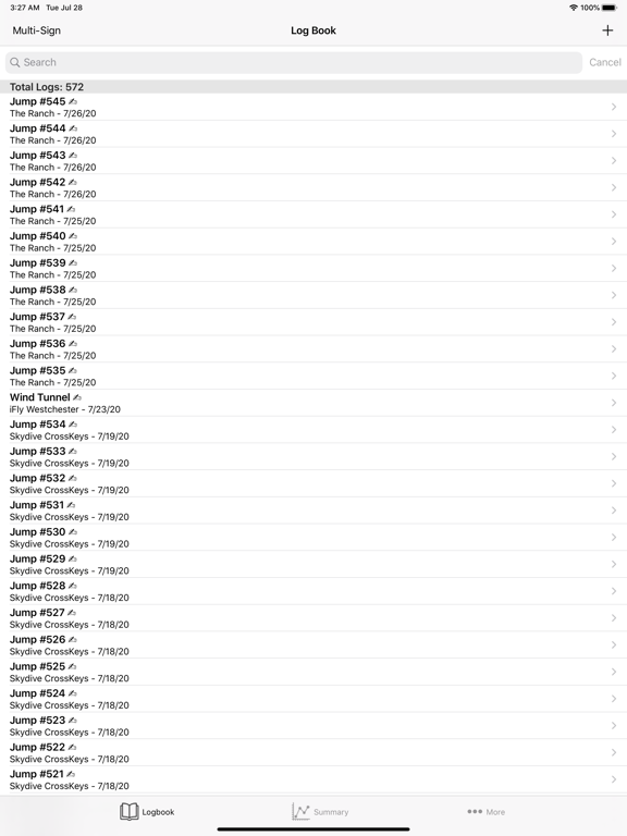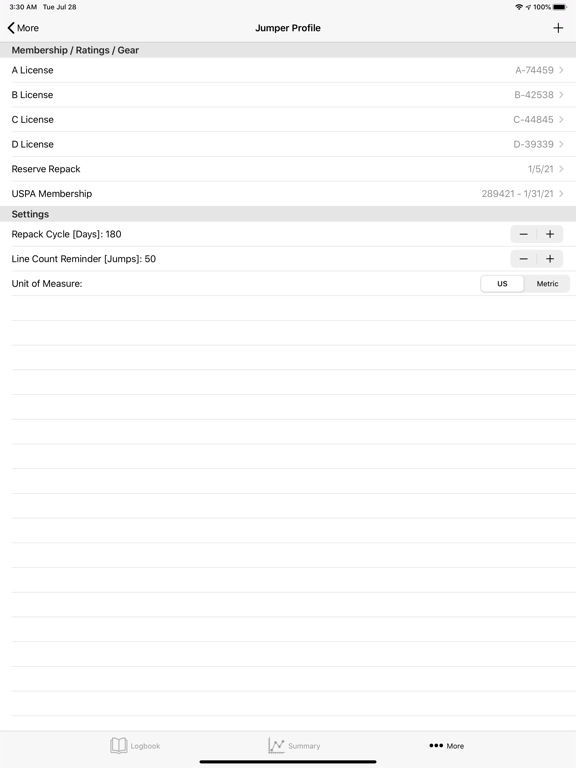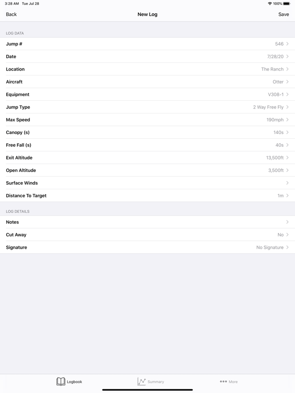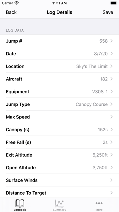 A Simple and Clean USPA Approved Digital Logbook for Skydivers Ratings, Membership, Line Count and Repack Date Tracker Comprehensive List of Metrics on Your Logbook Data Enter and Store SkyDive / Wind Tunnel Logs View & Export Your Logbook as a PDF Swipe to Re-Arrange Log Entry Fields Support for Signature & Multi-Sign Dropbox Backup and Excel Upload Location Based DZ Selection USPA SIM 3-1 Compliant