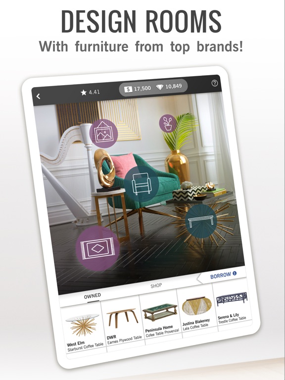 * Play with real life, high-end brands as you learn about different interior design styles.