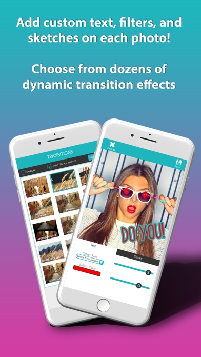 The default settings already have beautiful random transitions built in. If you want to further customize your slideshow, just tap on any photo where you can add a filter, a frame, or custom text if you'd like.