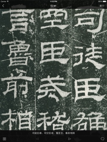 本应用收集了中国历代书法名碑高清拓本111套,并配有简介和对应文字。