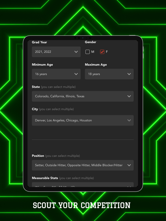* ATHLETES TAB: Be discovered by coaches from the stats you’ve entered in your profile. Find your competition and see where you stack up. Refine athletes with filters including: