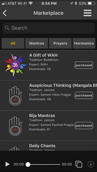 Each Mantra has an information section that will give a brief description including: name, intention, how to use, notes, etc. This will enable you to understand and choose the Mantra(s) that can assist you in your life. The tool will let you compose and listen through a set of Mantras which is referred to as a Raga. Each Mantra is meticulously recorded by individuals well versed in Sanskrit and proper enunciation of the language. This ensures the vibrational power of the Mantra.