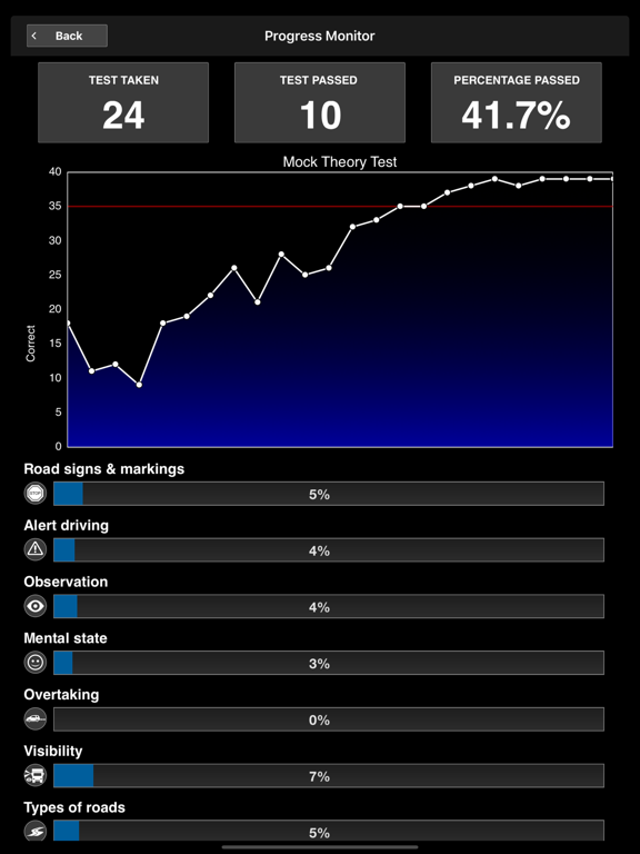 * Mock Theory Test: Perform a simulation under the same conditions as the official test. When you finish the test you will see your score and review all the questions. View full explanations after each question to help you remember the correct answer for next time.