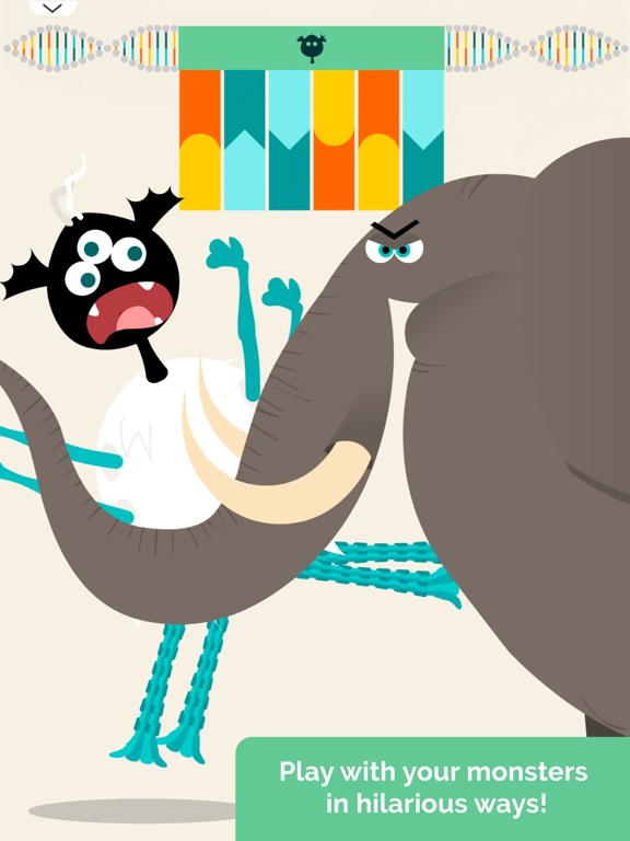 Once you complete all 6 body parts it's time to play with your monsters and have fun! Feed them, tweak them, push them, squeeze them, make them jump or slide! Go for a skateboard ride with them! Get to know their quirks. Do they enjoy being chased by an elephant, being hypnotized or listen to music? Are they afraid of the dark? Discover what makes them sneeze, laugh or cry, how their voice changes after mutating their faces!