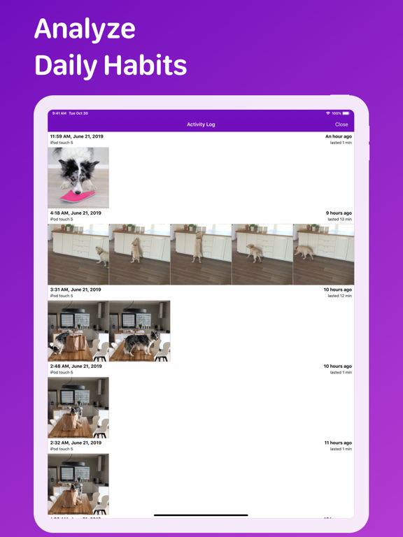 Get instantly notified of any disturbance in pet activity by the app's sound and motion alerts. Enjoy the sense of security, because if your dog is barking or has a separation anxiety, you will know it right away. Sound and motion alerts are automatically triggered whenever any dog or cat activity is detected by the pet camera. Photos from the camera are saved in the Activity Log, sent to your iPhone, and Apple Watch.