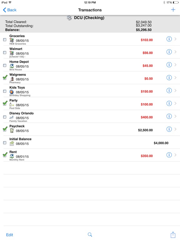 Reconcile your Transactions by Tapping on the Check Box in transaction register.
