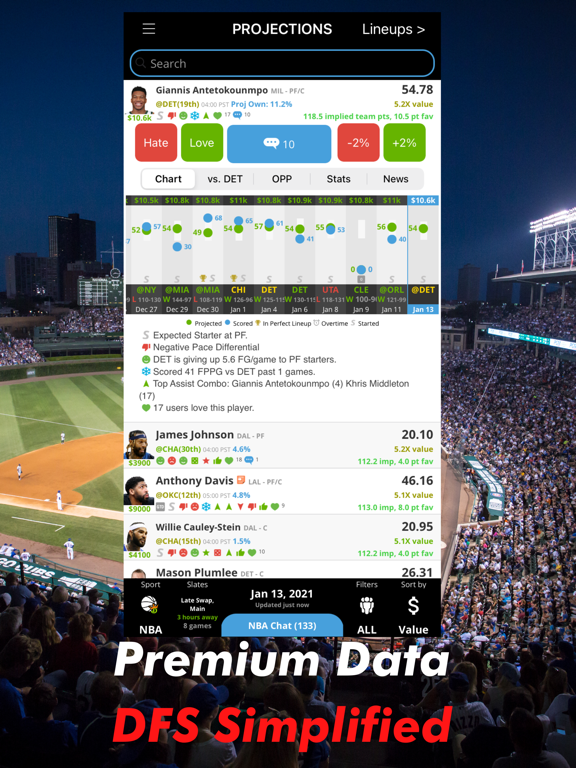 Our secret sauce helps determine the best value for your salary requirement. Easily find hidden gems and underrated value players based on solid data. Generate multiple variations of lineups to maximize your odds.