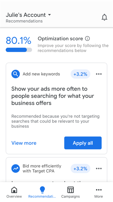 The Google Ads mobile app helps you stay connected to your campaigns while on the go. In addition to monitoring your campaigns in real-time, you can review high-impact recommendations to improve performance and take action quickly and easily.