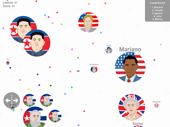 You are a very hungry dot, wandering around and eating smaller dots to grow. Likewise, large dots out there, seeking to eat you. In this version, we added meme about presidents around the world to the dots, hope the game will bring to you enjoyable time. Now survive at long as you can and comparing your high score to other players around the world!