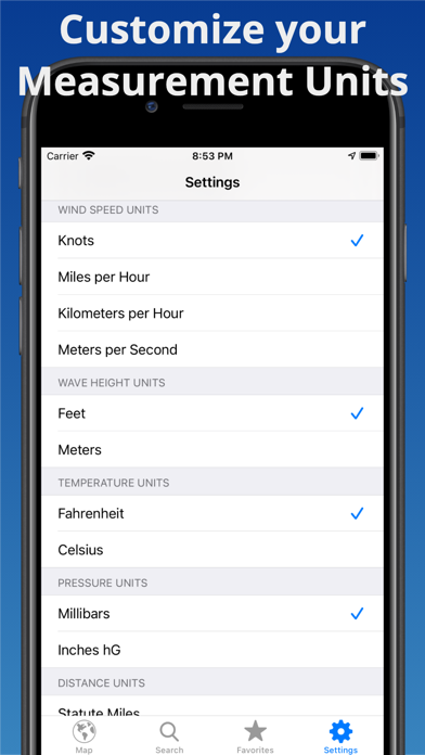 With our intuitive map interface, just tap on any buoy to get its latest reported conditions. A second tap will give you a complete summary of current conditions, or a graph of wind, wave, temperature, or pressure information so you can not only see what it's doing now, but what it was doing this morning, or even last week.