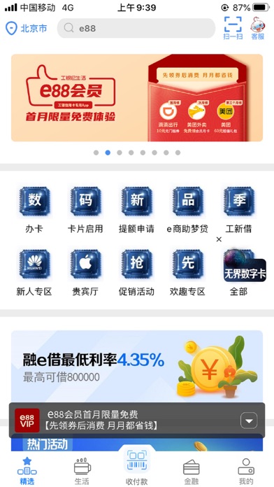 工银e生活是中国工商银行信用卡官方客户端,是集生活、消费和金融服务于一体,整合支付、融资、丰富生活场景的综合化移动智能服务平台,意在打造智能、便捷、开放的消费金融生态圈。“工银e生活”整合了安全高效的金融服务、便利多样的生活场景服务与丰富实惠的商品服务,打通B端C端,覆盖线上线下,既可满足C端用户在用卡、融资、消费等多元化需求,又可为B端商户创造更多销售机会,带来更多客户;通过为个人客户和商户提供一揽子解决方案,建立了中国工商银行与客户、商户之间的互动连接平台和流量入口,满足了客户日益增长的对美好生活的需求,汇集丰富的用卡及生活场景,让金融触手可及。 更多精彩等你发现!