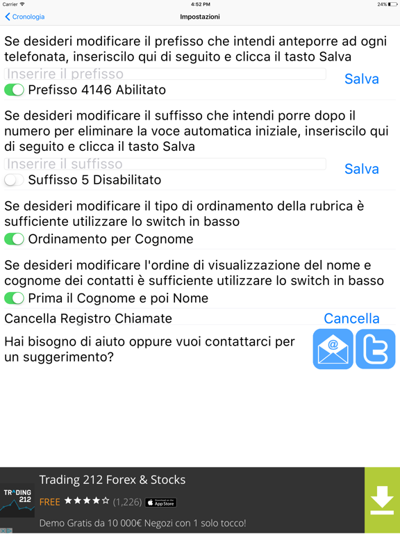 - se nella sezione IMPOSTAZIONI è stato abilitato il prefisso e/o il suffisso, allora la chiamata sarà effettuata con il prefisso selezionato e/o il suffisso, altrimenti verrà effettuata senza alcun prefisso;