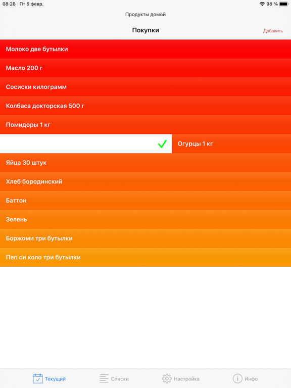 Список можно добавлять, корректировать, отсылать по СМС, отмечать продукты как купленные или удалять их простым смахиванием влево или вправо. Список легко сортируется. Самые важные покупки удобно поместить вначале, они выделяются красным цветом и по мере значимости цвет меняется на желтый. Купленные товары окрашиваются в зеленый цвет и помещаются вниз списка.