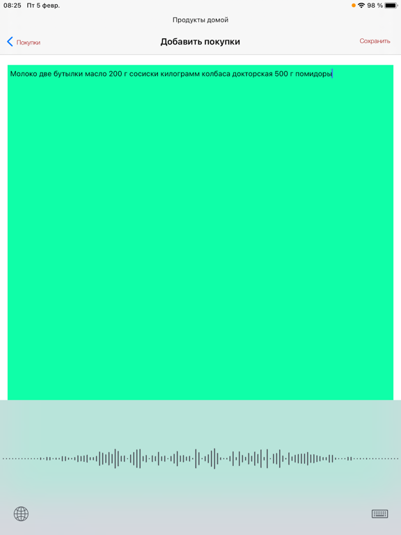 То есть в любой момент, даже занимаясь делами, на ходу или за рулем автомобиля, просто говорите все, что Вам нужно приобрести и приложение распознает Вашу речь, преобразует ее в текстовую строку, а затем проанализирует эту строку и по определенным правилам разобьет на отдельные продукты и поместит в таблицу – список. Произнеся всего несколько фраз Вы получаете готовый список и уже не забудете, что Вы нужно приобрести в ближайшем супермаркете.