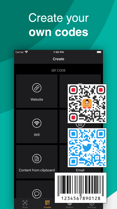 • Scan, create, share and manage your own QR codes. QRbot uses Apple's built-in native scanning technology delivering quick results. Code formats supported include; QR code, EAN 13, EAN 8, UPC-A, UPC-E, Code 128, Data Matrix, PDF417, Aztec, Interleaved 2 of 5, Code 39, Code 93, Codabar, DataBar, etc.