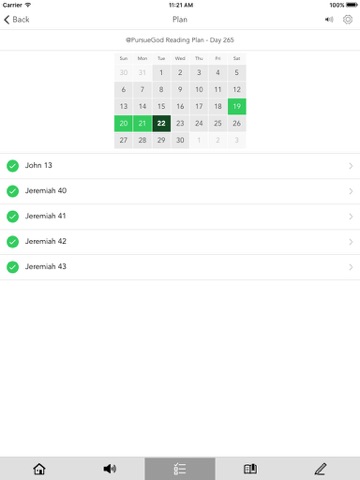 * Free Audio Bible: Click listen and you are instantly listening to the daily devotional plan. You can also look up any passage you want, the listen tab is in the bottom right hand corner at all times.
