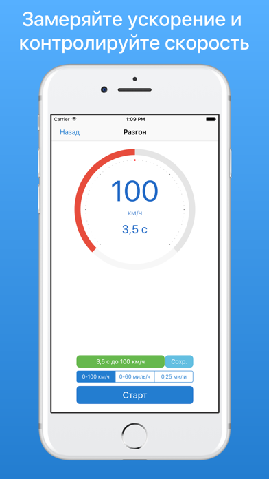 Измеряйте ускорение в удобных Вам единицах км/ч, миль/ч, 1/4 мили.