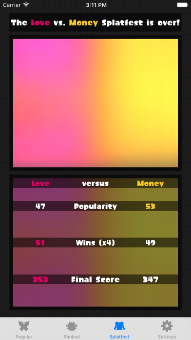 - See various Splatfest information (including a countdown to the start of the next Splatfest, current stages with a countdown to the end of the Splatfest and final Splatfest scores) for all regions
