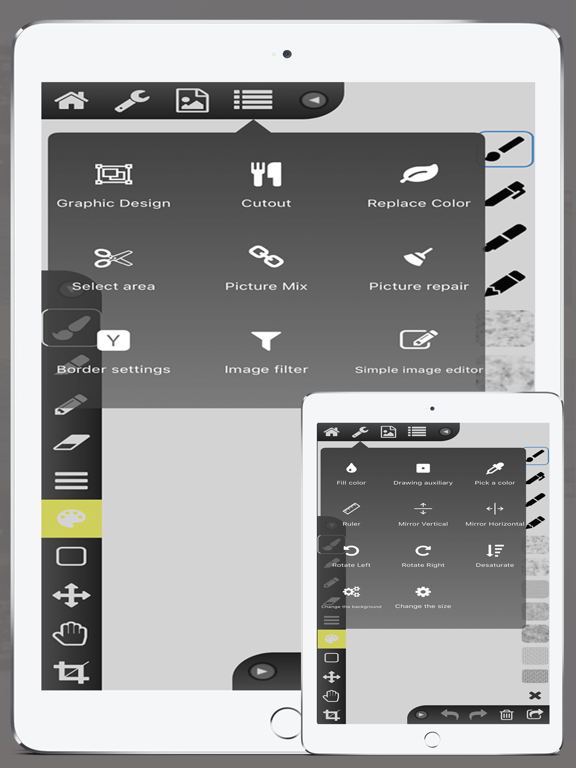 More features: layers, eraser, pick up picture colors, rotate, flip, crop, mosaic, image filters, emoticons, change image size, cutouts, fills, selection tools, gradients, and more.