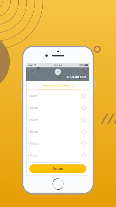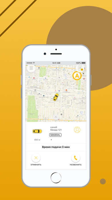 Приложение сообщит о времени подачи такси, марке автомобиля и его госномере. После завершения сможете увидеть стоимость поездки и общее расстояние.