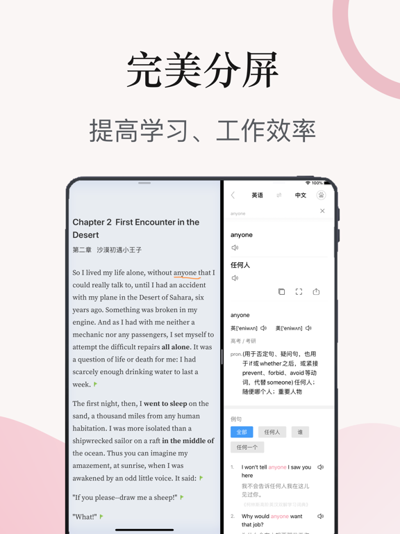 - 快速输入你想翻译的任何句子/短语/字,即时翻译结果。