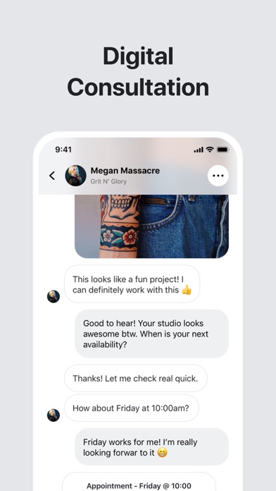 - Book your next tattoo: create a booking request to contact multiple artists in your area, or book directly with your favorite artist within the app.