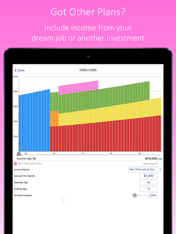 See your income over the next 50 years in a colorful, easy to understand graph. Play with different retirement dates to see how your income is affected. You may be surprised – one user discovered she could afford to retire two years earlier than expected.