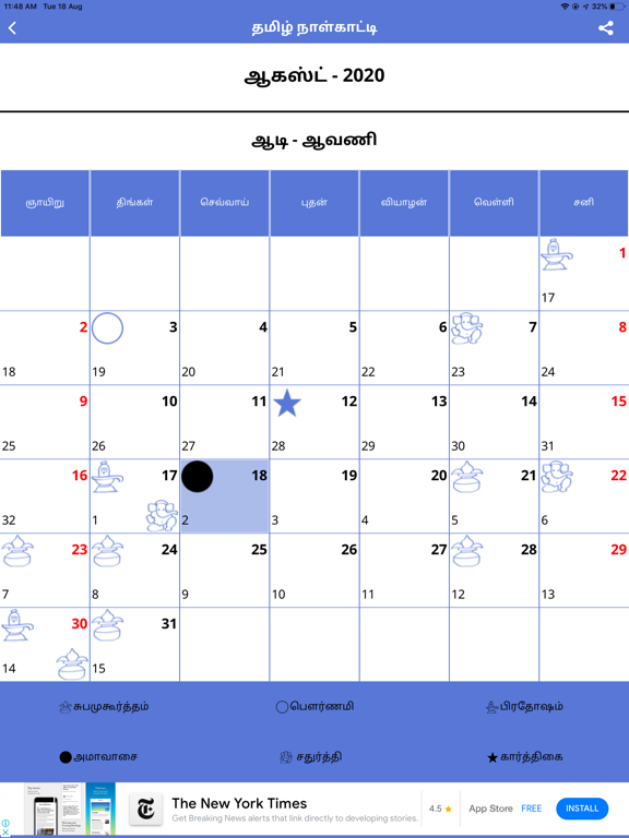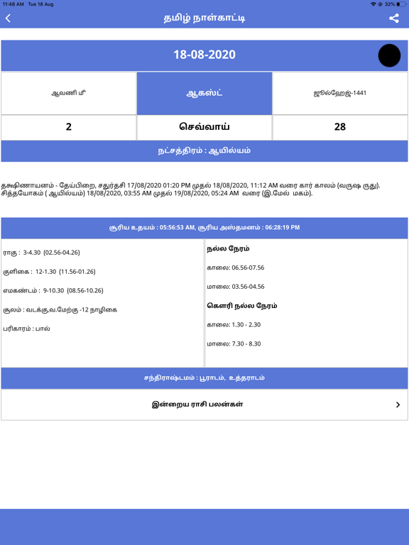 Say no to paper calendars with Tamil daily calendar 2020! This app enables users to get the daily and monthly dates and auspicious ritualistic information associated with the date and time. Also get your zodiac sign information, astrological forecasts (Rasipalan), horoscope, astrology and daily quotes at your fingertips through this Tamil daily calendar.