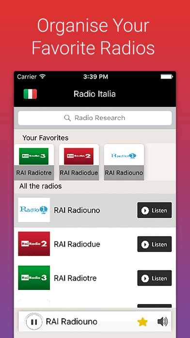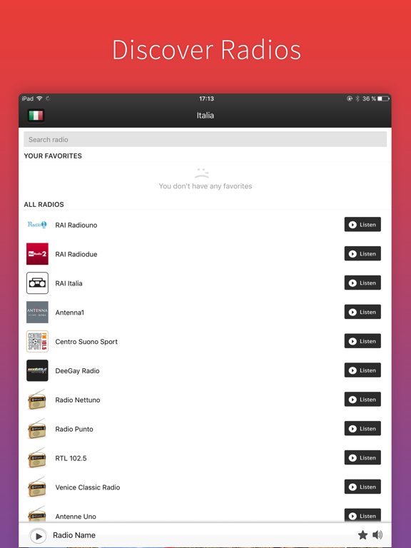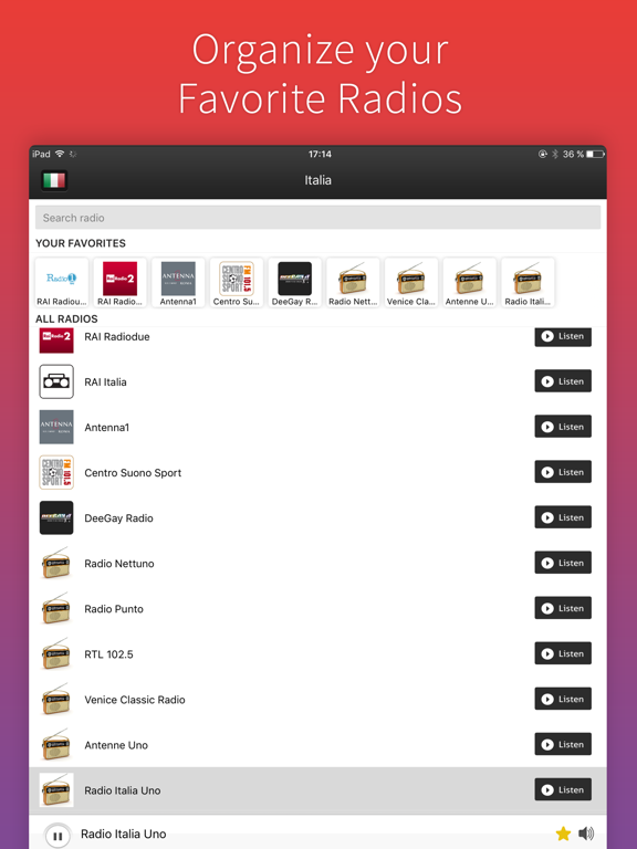 A real music finder Pandora box for real music gourmands. With Radio Italy you will find your favorite playlist, best music streams and coolest fm podcasts.