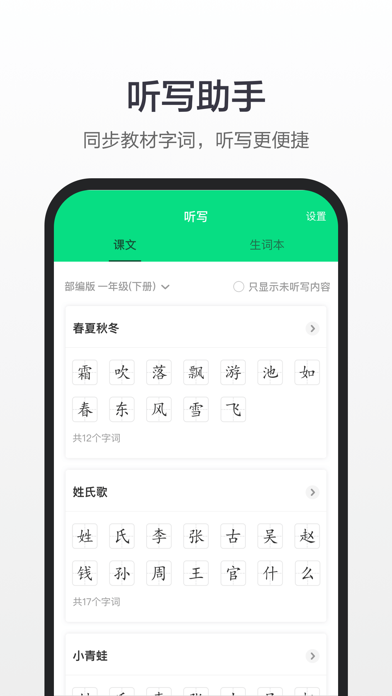 5.拍照识字、拍照朗读、笔顺播放、译文对照、字词听写、作文助手等特色工具。