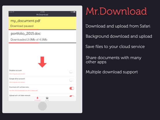 Mr.Download is a fully featured download manager that allows you to download files to your device directly from Safari or many other apps supported.