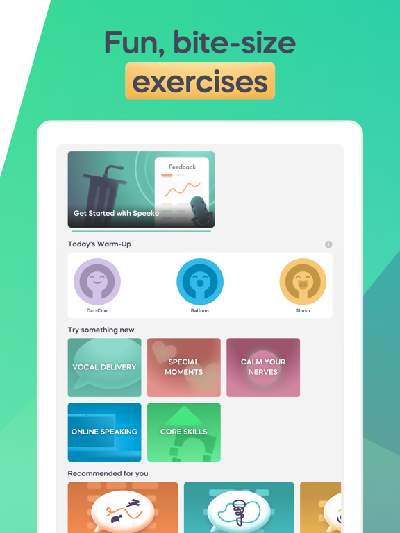 Have you dreamed of giving your own "I Have a Dream" speech? Ever feel like anxiety has gotten the best of you when you were on stage? Speeko will teach you the core speaking techniques to achieve effective delivery of your message when it matters most. Use the voice recorder to practice for an interview, a debate team event, or speaking off-the-cuff (like giving a wedding toast). After that, you' get instant, personalized feedback on how well you did, including how quickly you speak, how dynamic you sound, and a filler word counter (your um's and ah's). The more you use Speeko, the better it gets. Speeko intelligently recommends lessons and exercises based on your performance. Our coaching library is full of tips to help you speak your best.