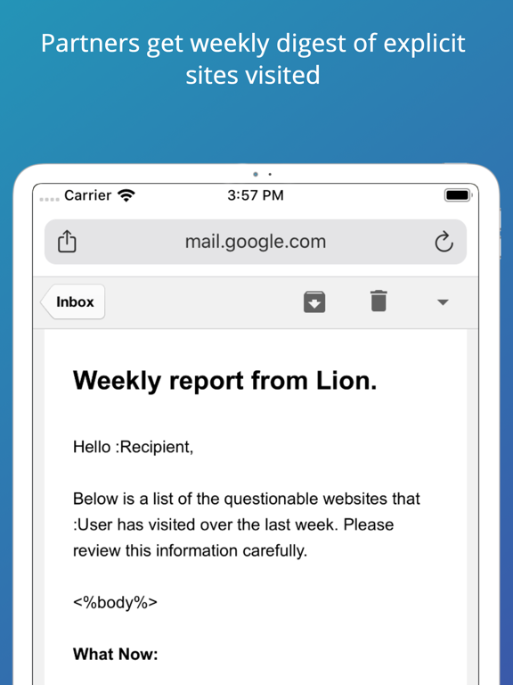 Lion is an accountability browser for the modern day. Use Lion to add people you trust as partners. These partners will receive an easy to read bi-weekly email of any explicit websites you visit. Using Lion will help reduce the temptation to visit explicit websites, change your browsing habits, and help you live a healthier more productive lifestyle.