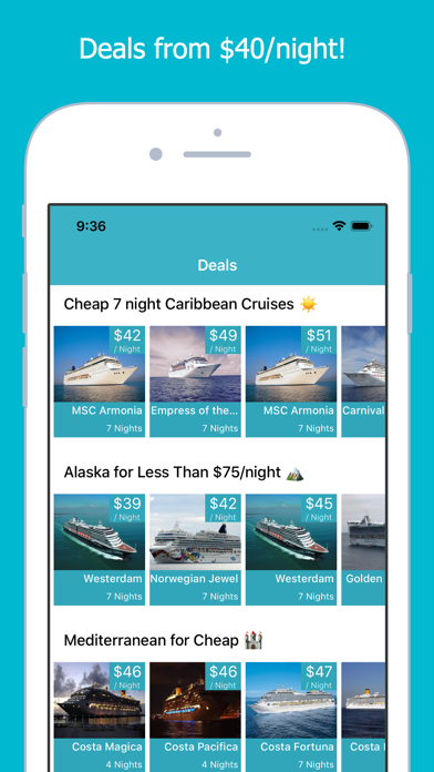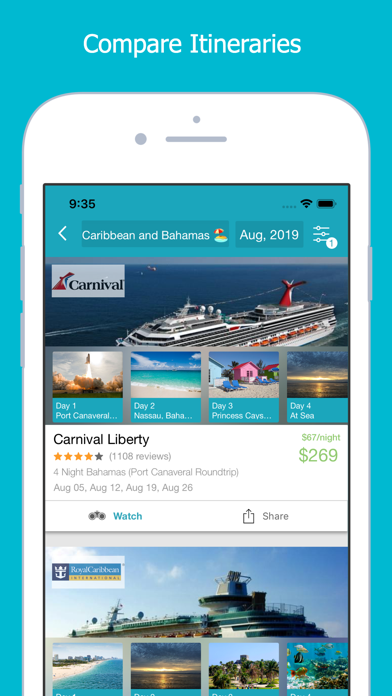Find the best cruises and cruise deals. The app searches every major cruise line such as Carnival, Royal Caribbean and NCL and lets you instantly compare prices from different sites to get the best deal. A simple search lets you see all the cruises and easily filter by price, cabin, port, line or more.