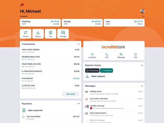 Account management: See account balances, transfer money between your IncredibleBank accounts and view your transaction history.