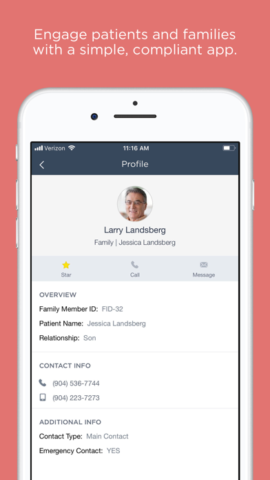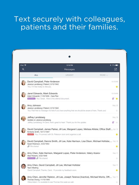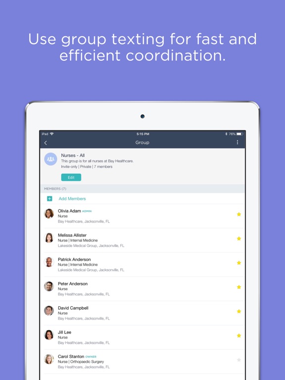 - Simple group texting for efficient coordination across departments and patient care teams; handling of staff call-offs, patient admissions, and other workflows