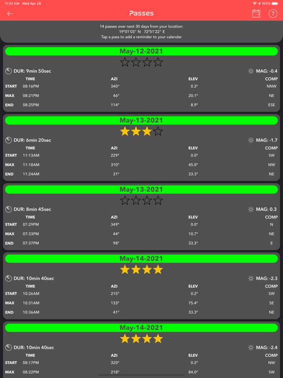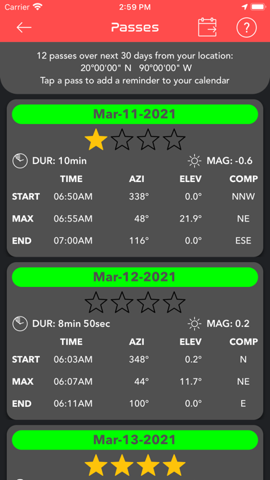 • Flyover pass ratings: 0-4 stars show you which will be the most visible based on brightness (magnitude).