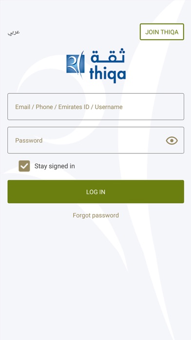 يمكنكم تسجيل الدخول إلى التطبيق باستخدام حساب ثقة الخاص بكم أو الاشتراك للحصول على حساب جديد لتسجيل الدخول.