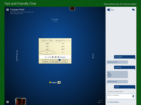 Let the fun begin. Play the game you love with friends and family or get matched with other live players at your level. Trickster Pitch offers customizable rules, so you can play Pitch your way!