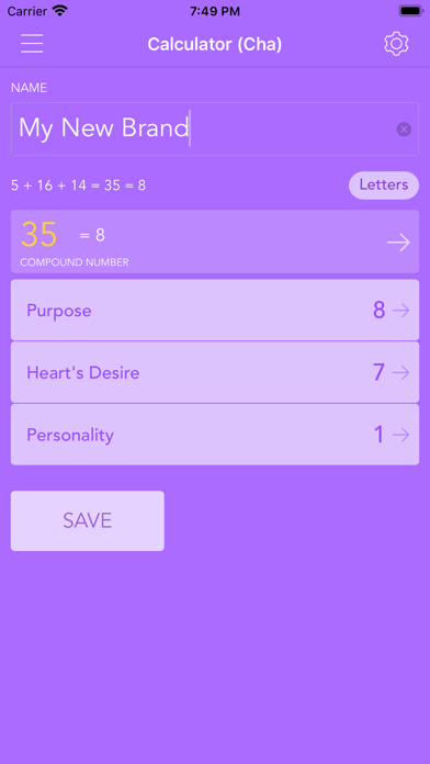 With "name calculator" feature you can calculate number values on the fly when you type a name. If you like the number values of the name you typed (personal, business, baby,...), you can mark them and save them on the list of your names for later use.