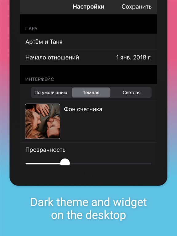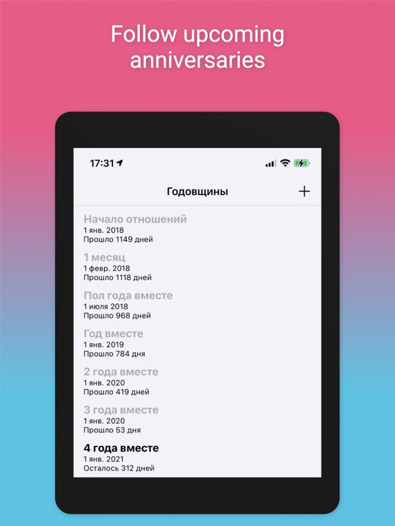 Our application together we made specially for couples. With it, you can see how long you have been together. To recieve a notification about the anniversary and never forget to congratulate your soul mate!